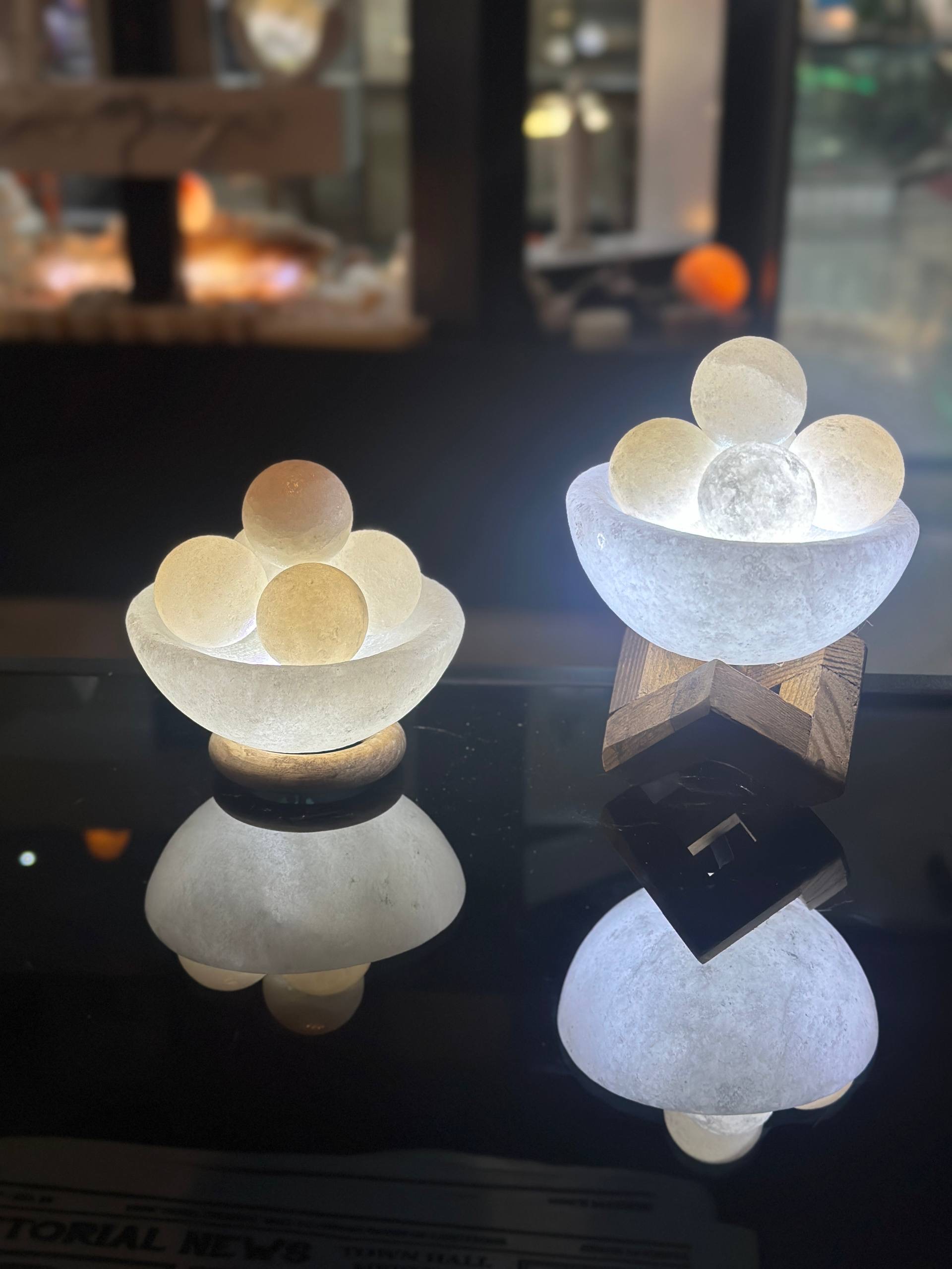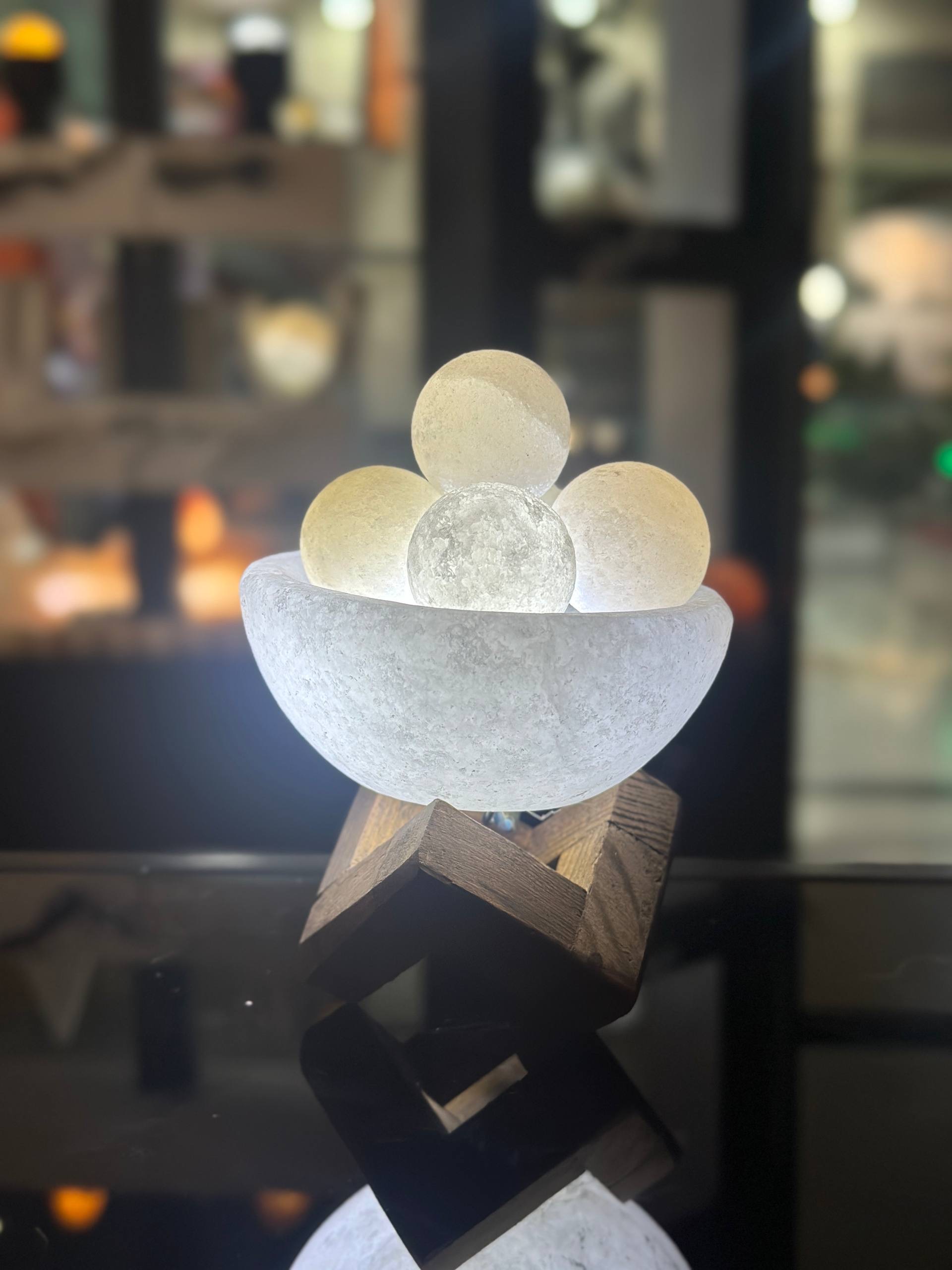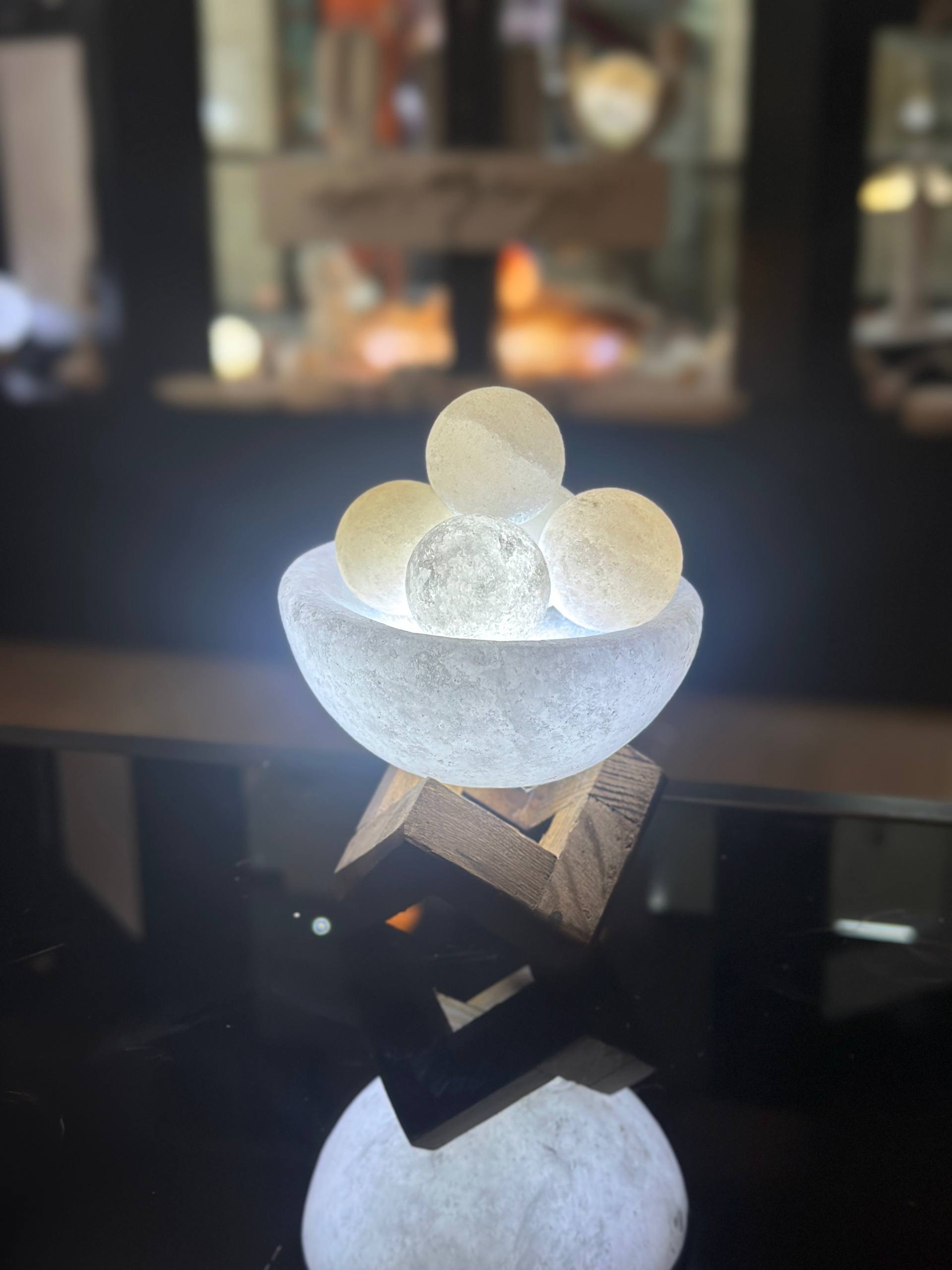 آباژور سنگ نمک طرح کاسه بزرگ باگوی ریز جنس مجسمه از پلی استر جنس گوی از سنگ نمک طبیعی هر سنگ نمک با دیگری متفاوت است و هیچ محصولی کاملا یکسان نیست
