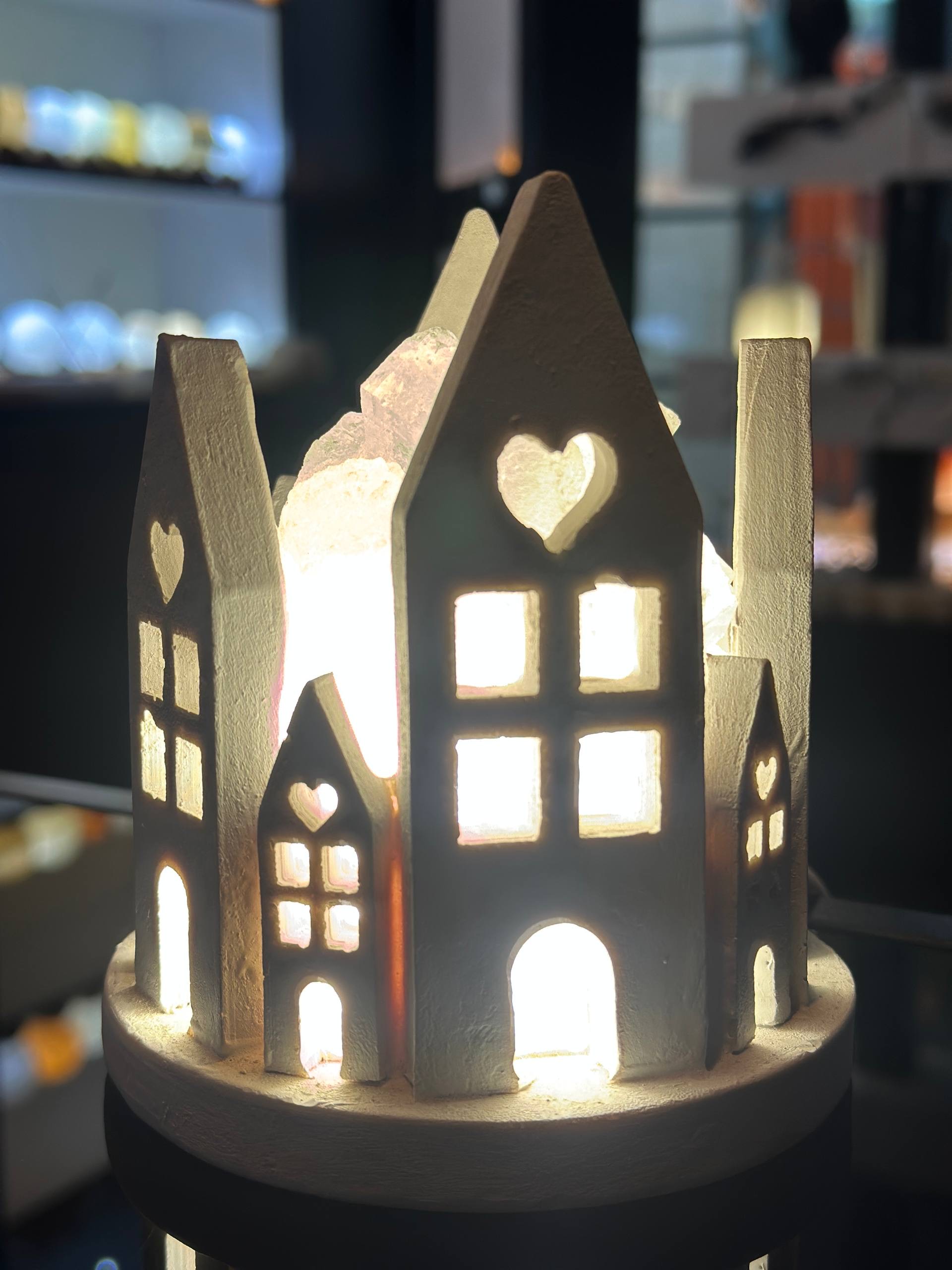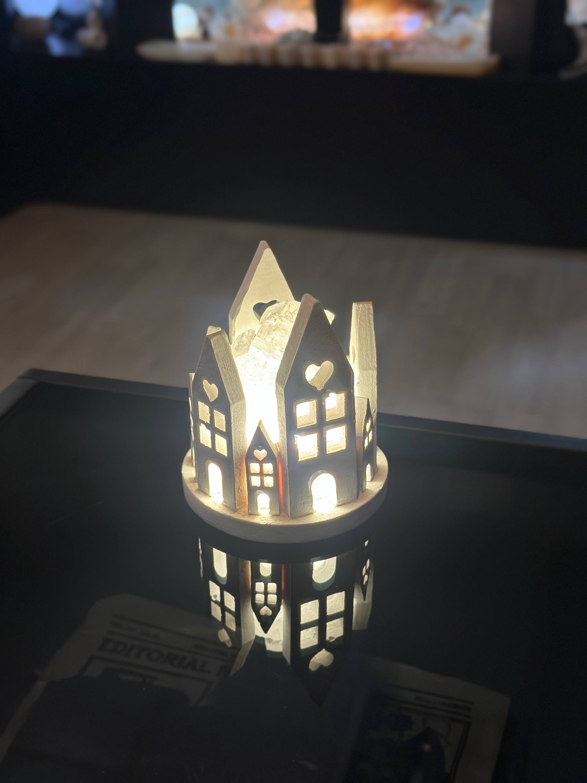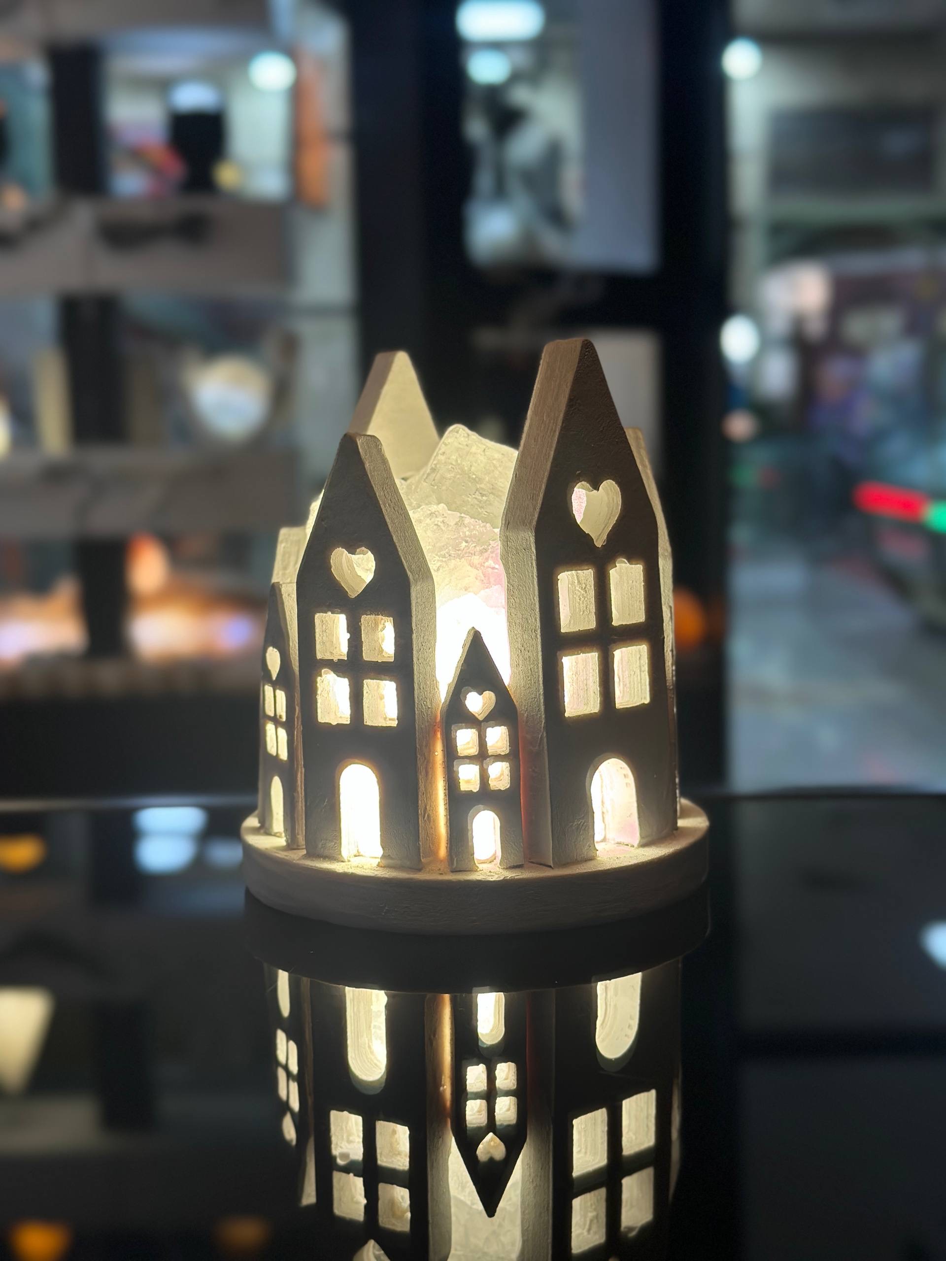 آباژور سنگ نمک طرح دهکده کوچک جنس مجسمه از پلی استر جنس گوی از سنگ نمک طبیعی هر سنگ نمک با دیگری متفاوت است و هیچ محصولی کاملا یکسان نیست