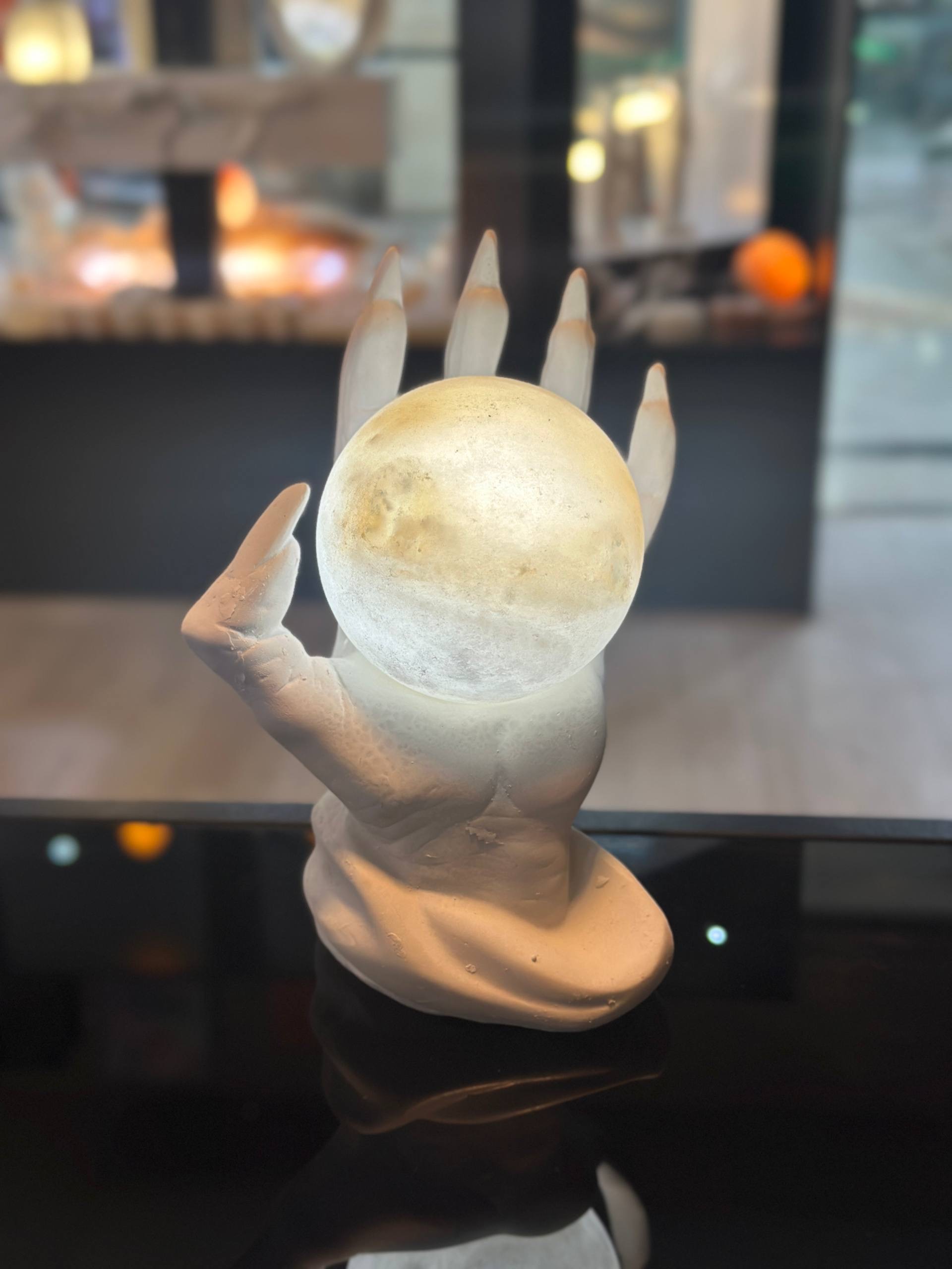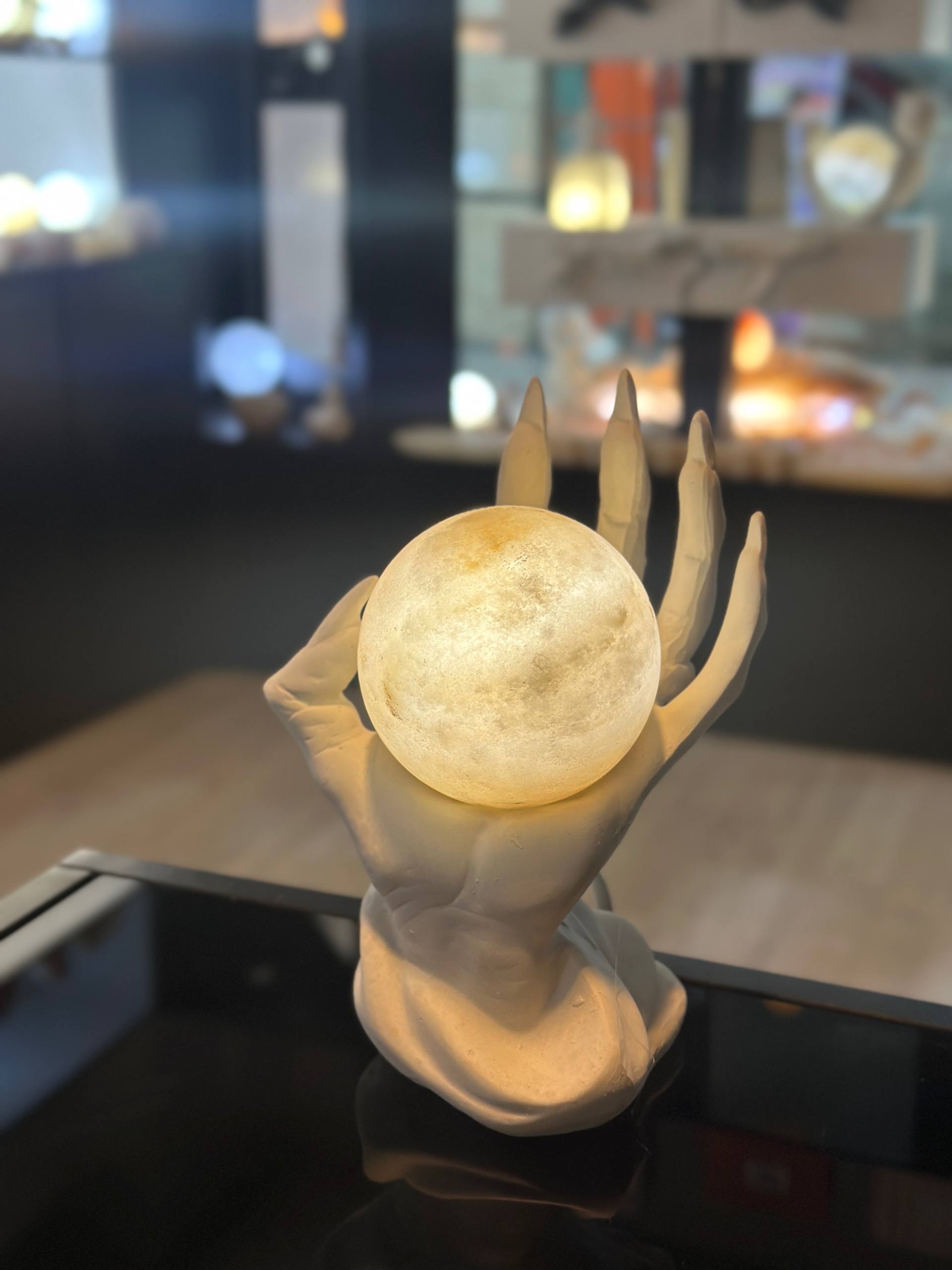 آباژور سنگ نمک طبیعی طرح دست زن جنس مجسمه از پلی استر جنس گوی از سنگ نمک طبیعی هر سنگ نمک با دیگری متفاوت است و هیچ محصولی کاملا یکسان نیست