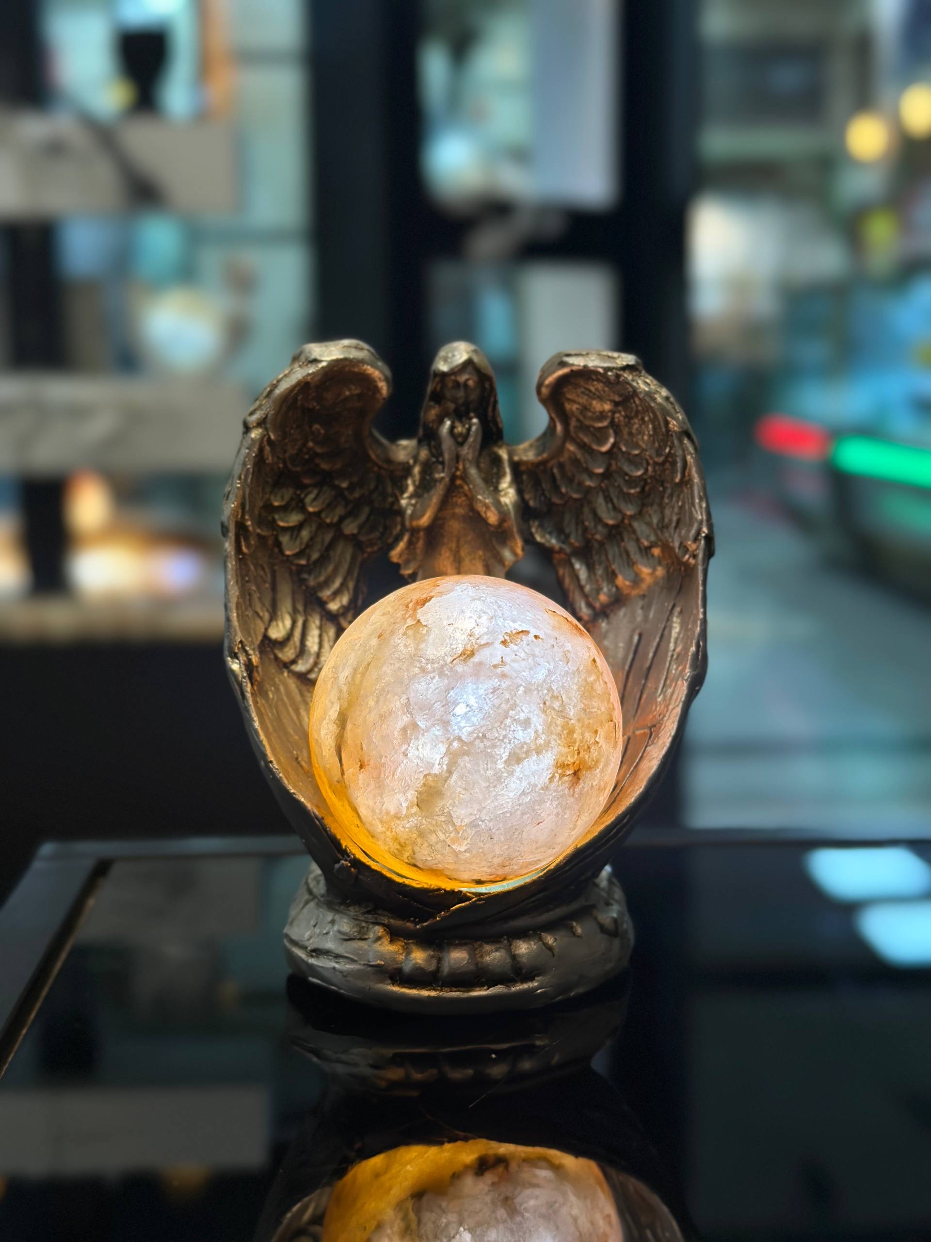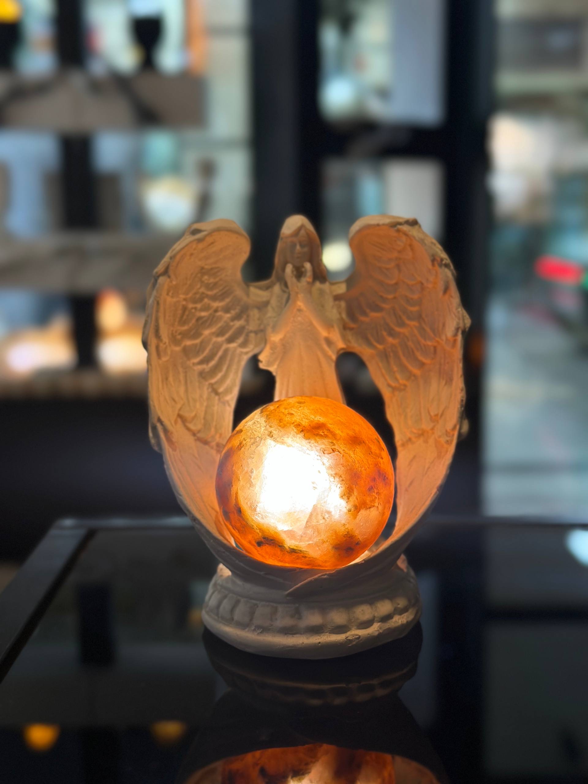 آباژور کلکسیونی فرشته کوچک جنس مجسمه از پلی استر جنس گوی از سنگ نمک طبیعی هر سنگ نمک با دیگری متفاوت است و هیچ محصولی کاملا یکسان نیست