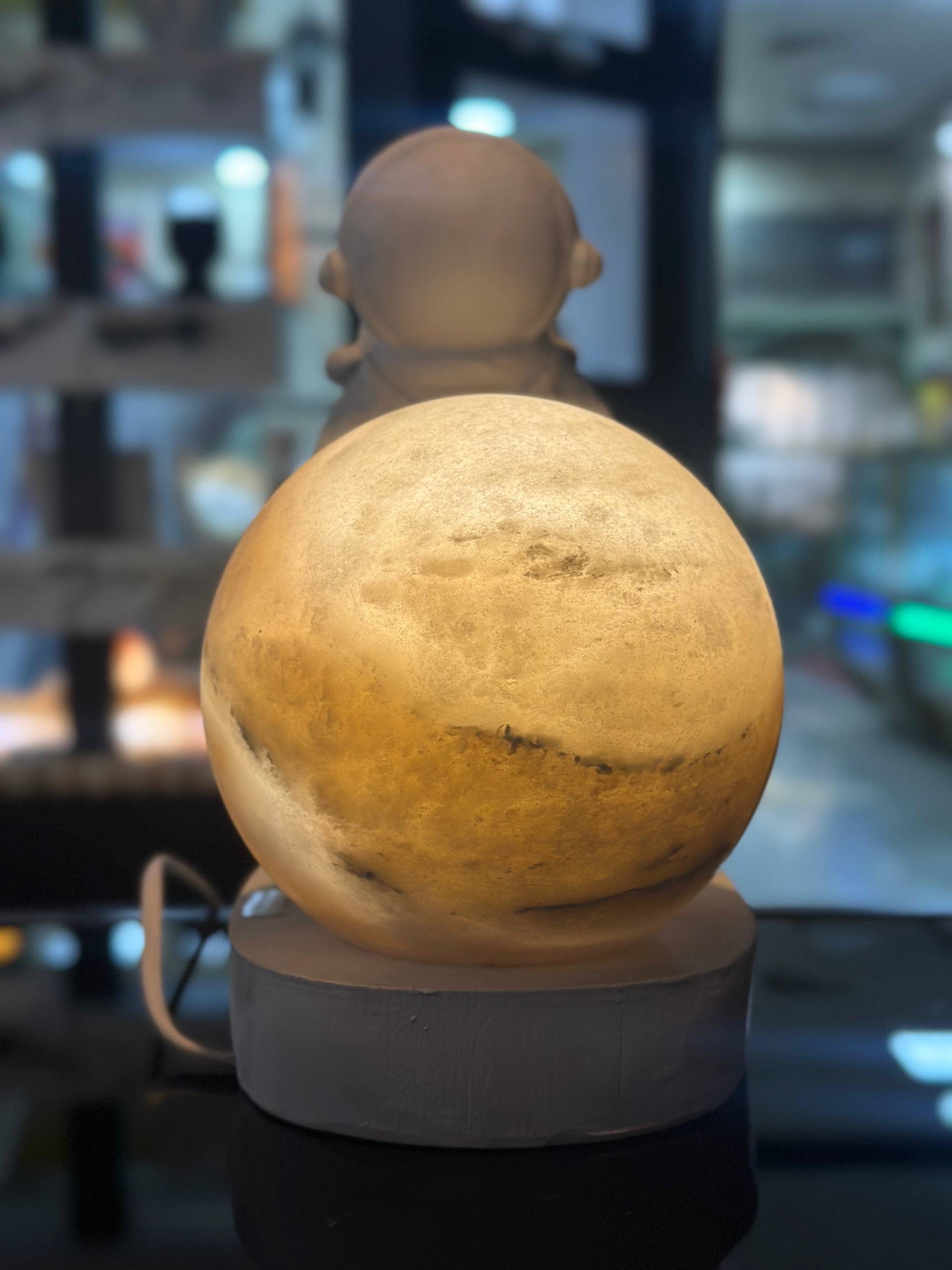 آباژور فضانورد بزرگ با گوی قطر 12 جنس مجسمه از پلی استر جنس گوی از سنگ نمک طبیعی هر سنگ نمک با دیگری متفاوت است و هیچ محصولی کاملا یکسان نیست