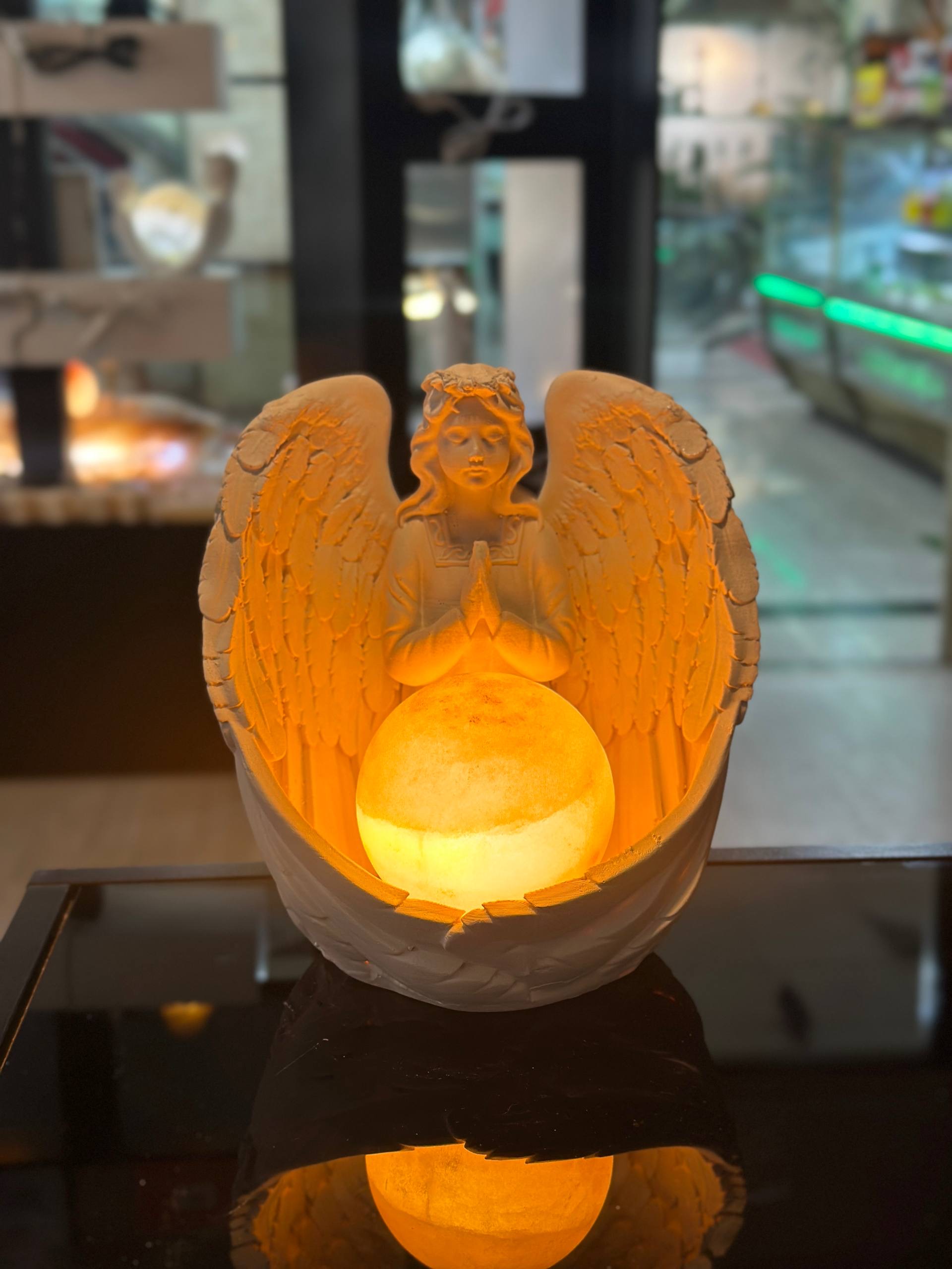 آباژورفرشته سنگ نمک با گوی 8 جنس مجسمه از پلی استر جنس گوی از سنگ نمک طبیعی هر سنگ نمک با دیگری متفاوت است و هیچ محصولی کاملا یکسان نیست
