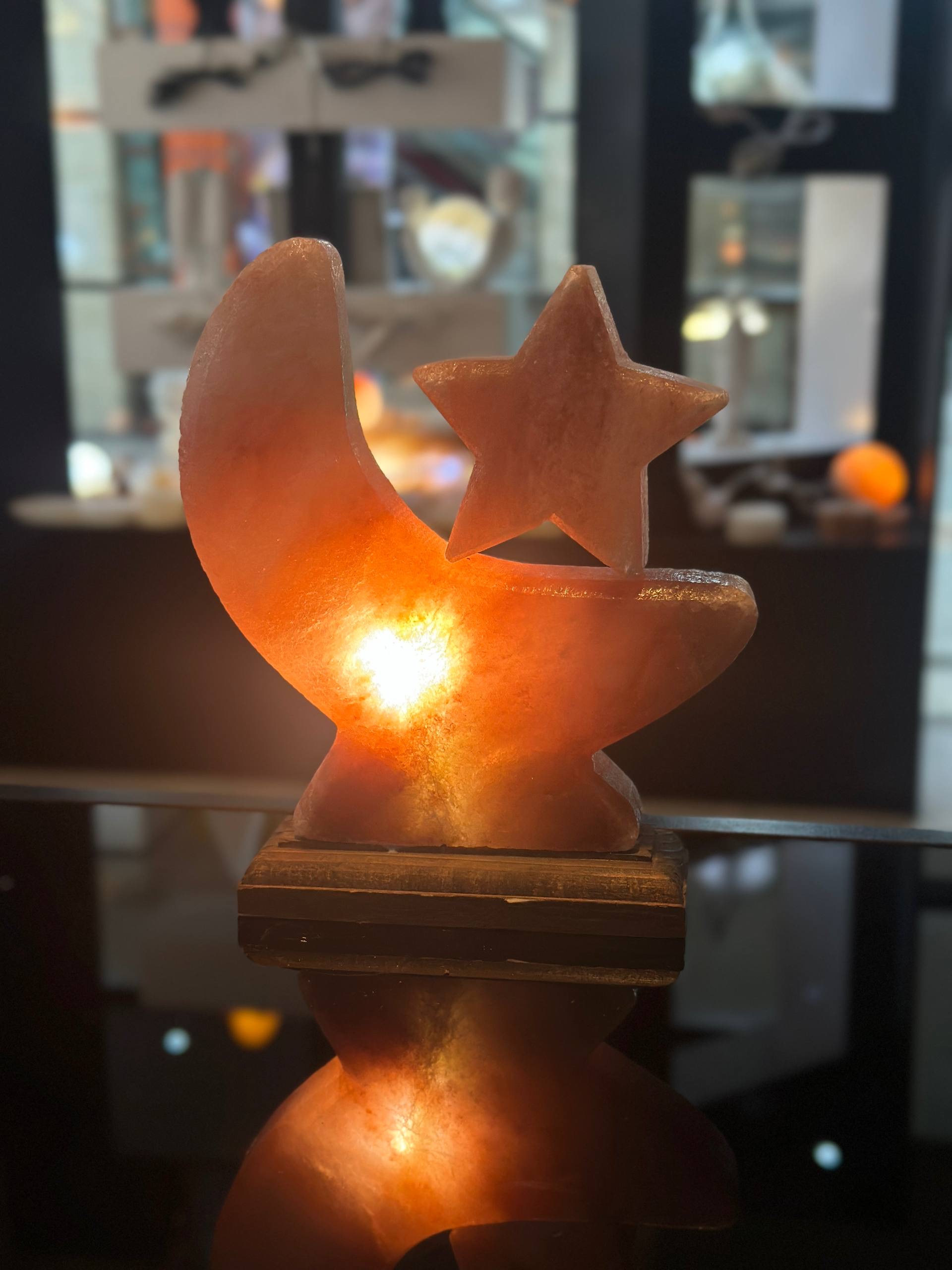 آباژور سنگ نمک طرح ماه وستاره جنس مجسمه از پلی استر جنس گوی از سنگ نمک طبیعی هر سنگ نمک با دیگری متفاوت است و هیچ محصولی کاملا یکسان نیست